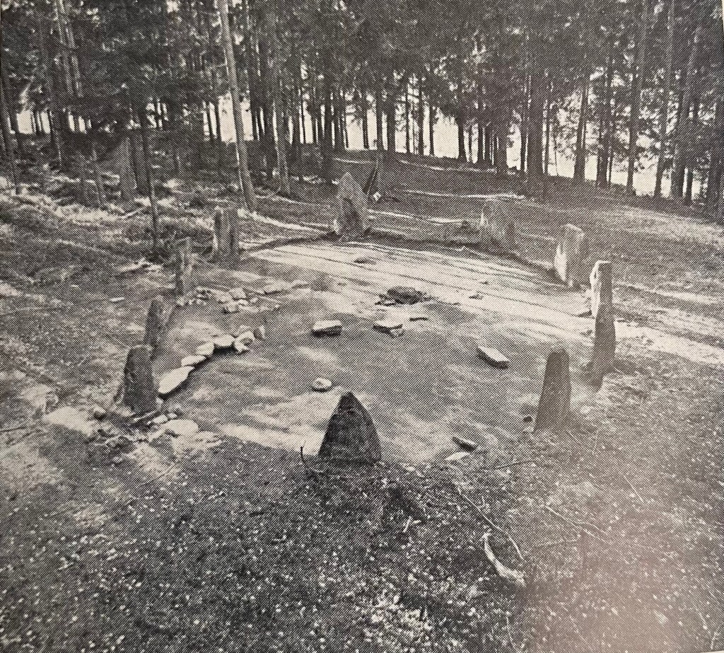 The circle is today oval in shape made up of 11 raised stones. There are a base of a broken stone in the middle that has been broken off. Originally there were two circles just next to each other forming a figure 8 or an infinity symbol. But the second circle is no longer visible.