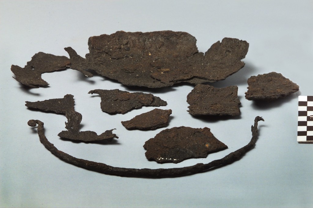 In 1911 archeologists examined the mounds and excavated some of them, the largest of them contained the richest grave goods. Inside they found the cremated remains of a human, a miniature sword made from bronze, a bronze ring, three pottery containers, tweezers, an iron cauldron, fragments of bone combs and glass beads.