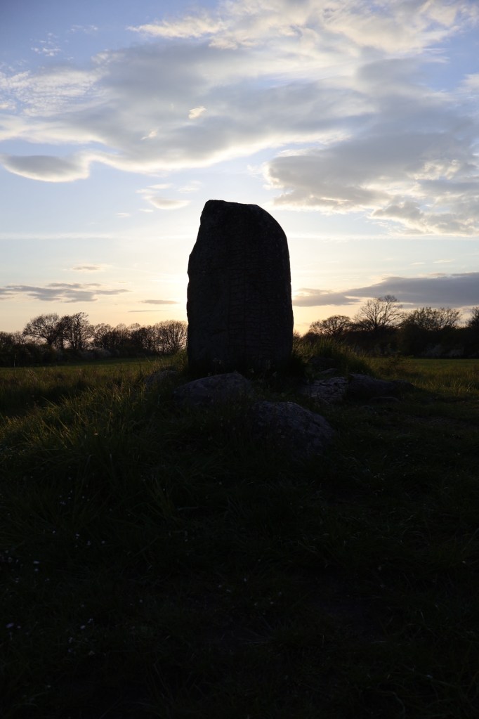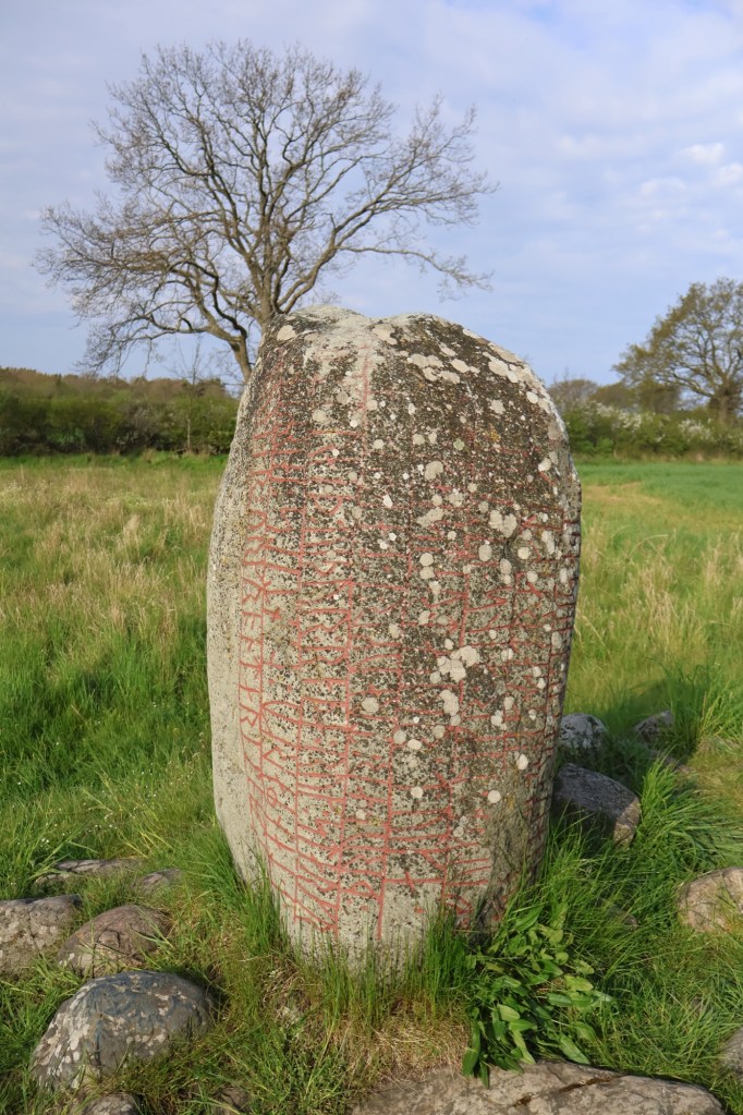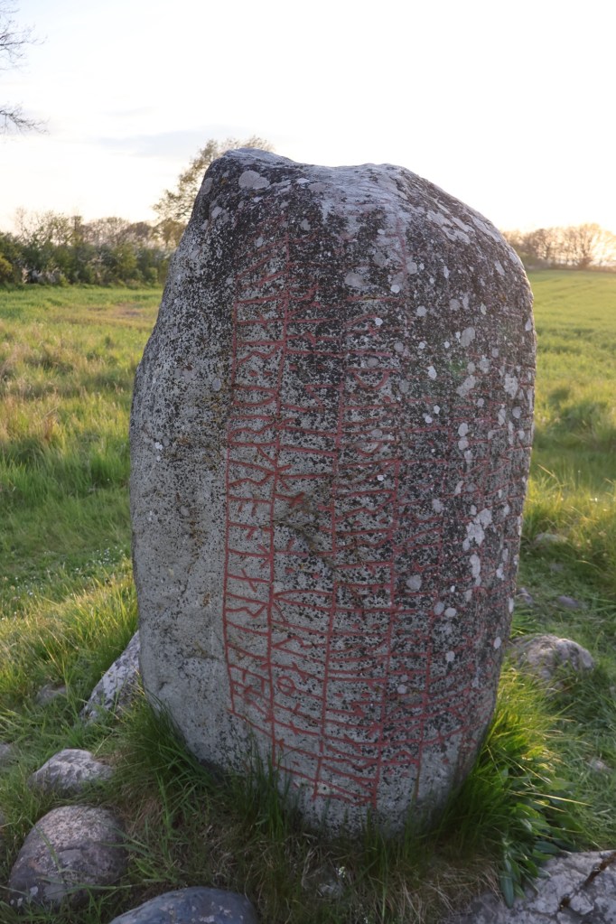 First of the location of the stone is strange, in the middle of a field near the sea quite far away from where people lived during the Viking Age. It’s more common for rune stones to be placed close to farms or villages or roads so that people can see and read them. The field was originally pasture land and according to a sketch made in the 1670s the stone was flanked by two mounds with small stones at the base framing them, the rune stone standing between the two like a much smaller version of Harald Bluetooths stone and mounds at Jelling in Denmark.
