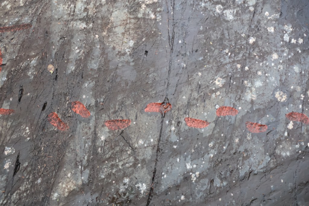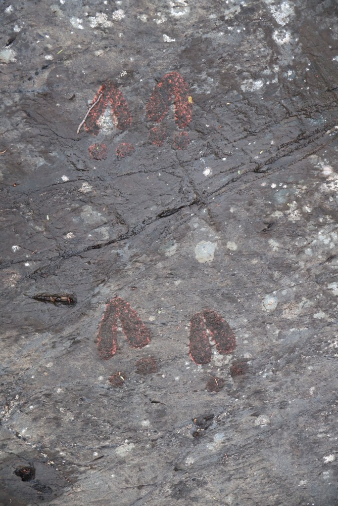 Other possible interpretations might be that the footsteps represents a shaman that communicates with or takes the form of the moose. The petroglyphs on this side of the river probably date to 4000 years ago.